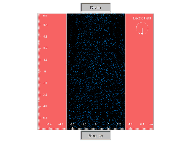 | This quantum dynamics simulation shows the principle of the junction field-effect transistor (JFET). Electrons flow through a semiconducting channel between source and drain terminals. By applying a bias voltage to a gate terminal, the channel is pinched, so that the electric current is impeded. |